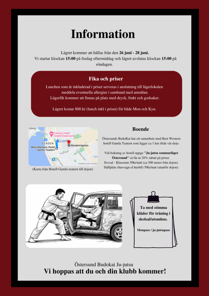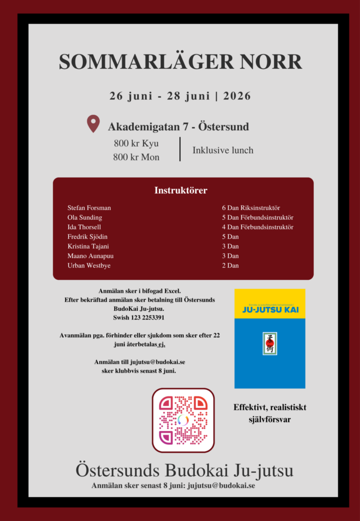 Nu är det dags igen för 4:e året. Östersunds Budo Kai bjuder in alla Mon, Kyu och Dan till ett 3 dagars läger med inriktning på att tillämpa våran stil i olika självförsvarssituationer. En blandningen av teknikträning från bältessystemet och att träna på att applicera våra tekniker i olika miljöer. Vi tränar i dojon och i vanliga kläder i olika miljöer, park, cafe, utomhus och nyhet för i år är att vi även kommer träna självförsvar i och omkring bil.